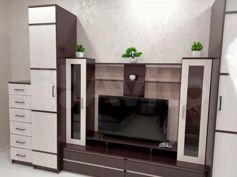 Кухня оборудована всем необходимым: холодильник, плита, вытяжка и микроволновая печь. В комнатах из техники - телевизоры, кондиционер, бризер. Из мебели — вместительные шкафы, двухспальная кровать и диван. Ванная комната совмещённая, оснащена современной сантехникой и стиральной машиной.
