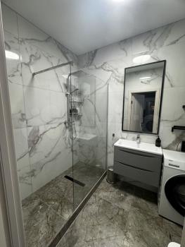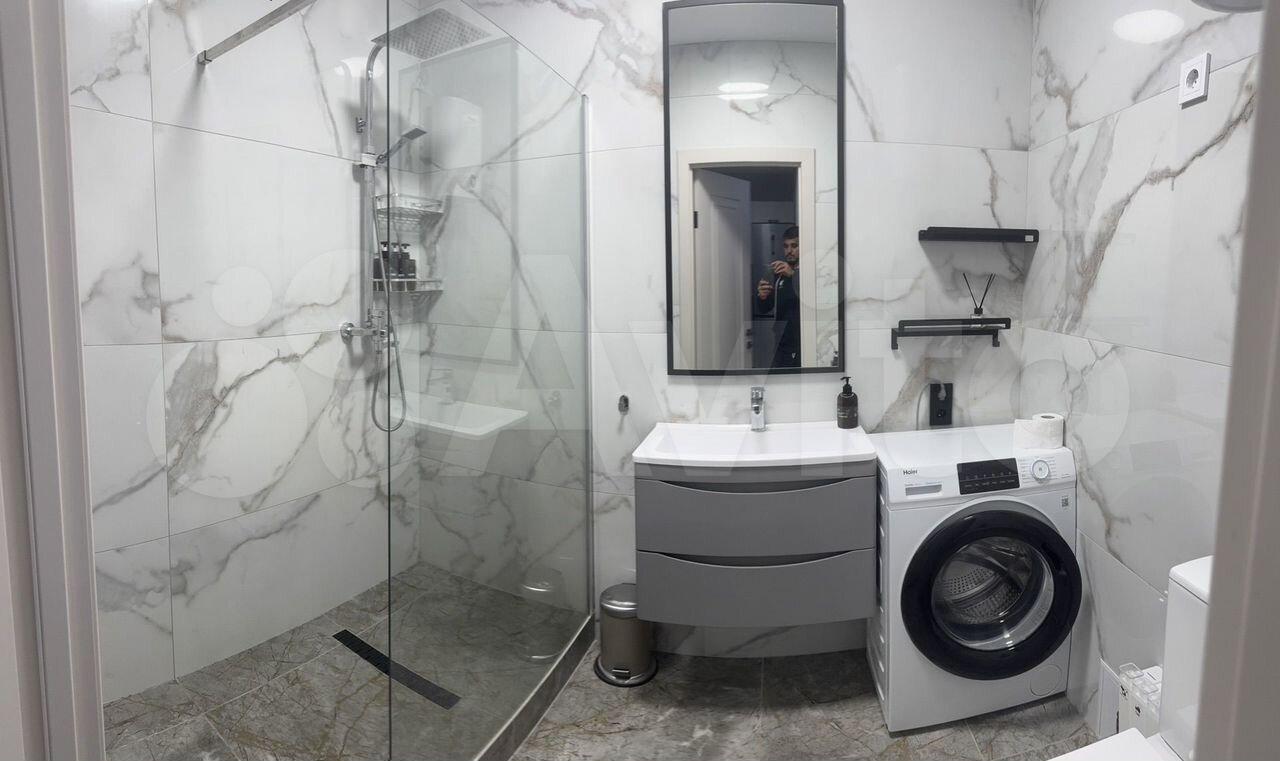 Кухня площадью 9 м² оборудована современной техникой, включая холодильник, плиту и микроволновую печь. В ванной комнате установлена стильная душевая кабина и стиральная машина.