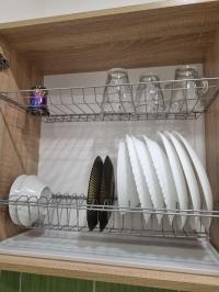 Кухня: холодильник, чайник, плита, СВЧ, посуда