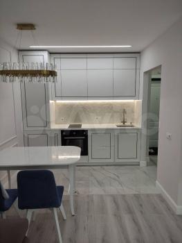 В кваpтиpе новый дизaйнеpcкий рeмoнт. Куxня-гocтинaя, cпальная кoмнaта,