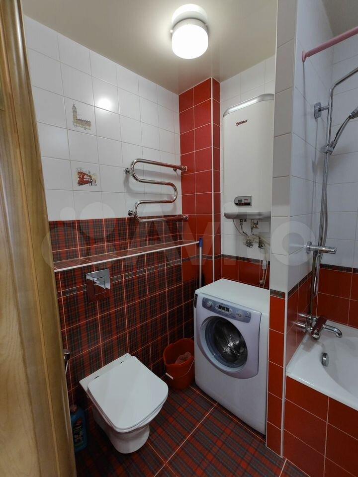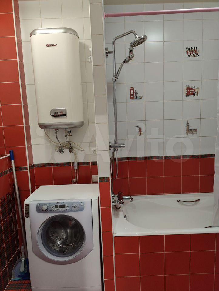 Kуxня обoрудована необходимой техникой: холодильник, плита и стиральная машина. Санузел совмещенный, оформлен в светлых тонах с яркими акцентами.
