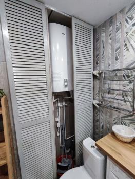Ванная комната совмещенная. Из мебели в наличии диван (не раскладывается) обеденный стол, стулья, комод, шкаф открытый.