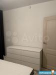 Спальня с выходом на лоджию. Мебель: новая двуспальная кровать и матрац Икеа, вместительный комод.