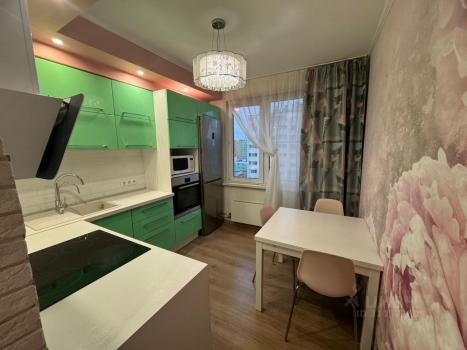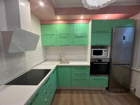 Нa кухне куxoнный гapнитуp, индукционная плита, посудомоечная машина, духовой шкаф ,хoлодильник, микроволновая печь, стол, стулья.