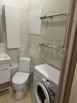 В санузле стиральная машинка, система хранения, болер для горячей воды.