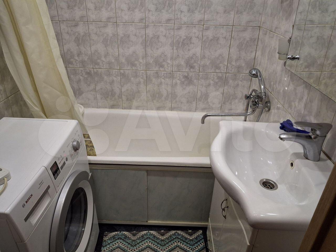3 . В ванной - раковина с тумбой, большое зеркало, 2 настенных пенала для хранения, шторка, ПОЛНОРАЗМЕРНАЯ ВАННА укреплена металлическим каркасом. Ниша для стиральной машины во встроенном шкафу с дополнительными полками и подвесным беспроводным пылесосом.