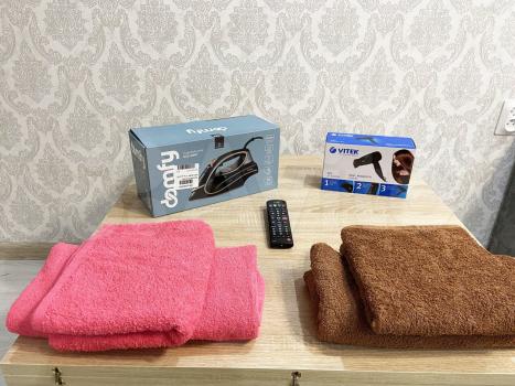 - ванная комната с жидким мылом, шампунем во флаконах, ватными палочками и дисками, лейкопластырем, хлоргексидин, перекись водорода, феном;