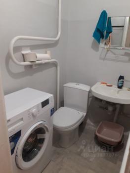 Санузел совмещенный: стиральная машина, зона хранения моющих средств и стредств для уборки.