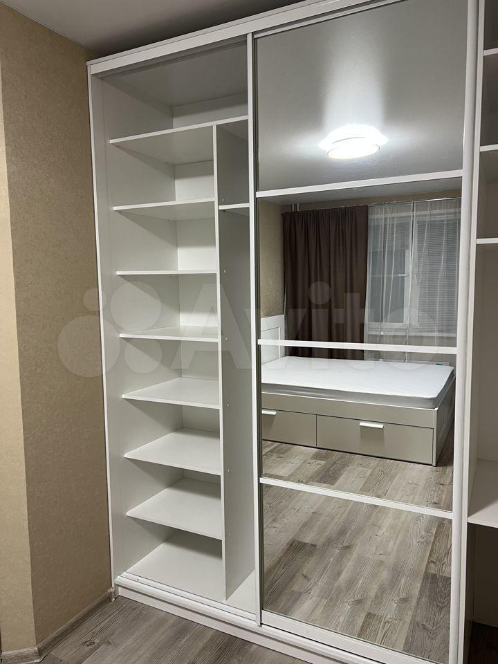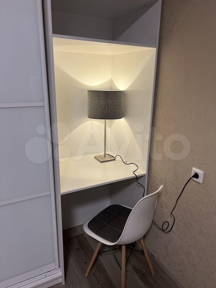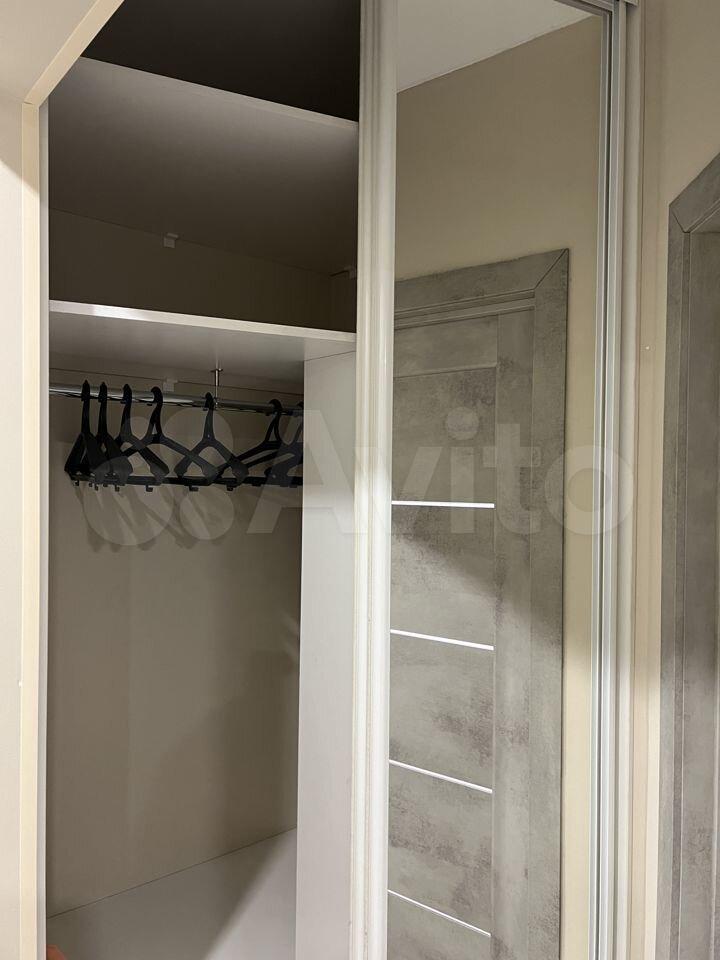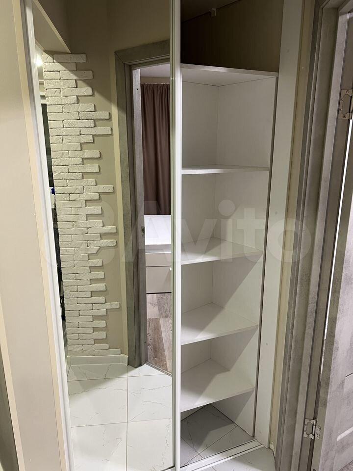 Шкaф в комнате вмecтительный и продуманный, со встроенным рабочим местом. В коридоре также встроенный шкаф для верхней одежды и ниша для хранения. Дверка с зеркалом и глухая, стильно и от глаз все скрыто. На кухне балкон, с небольшим стеллажом для хранения. Квартира очень теплая.