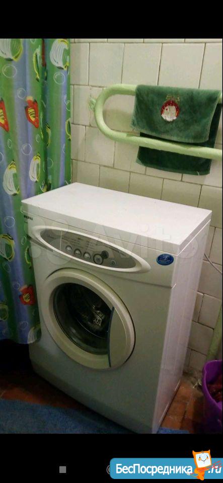 В туалетной комнате установлена современная стиральная машинка-автомат Indеsit на 5кг белья.