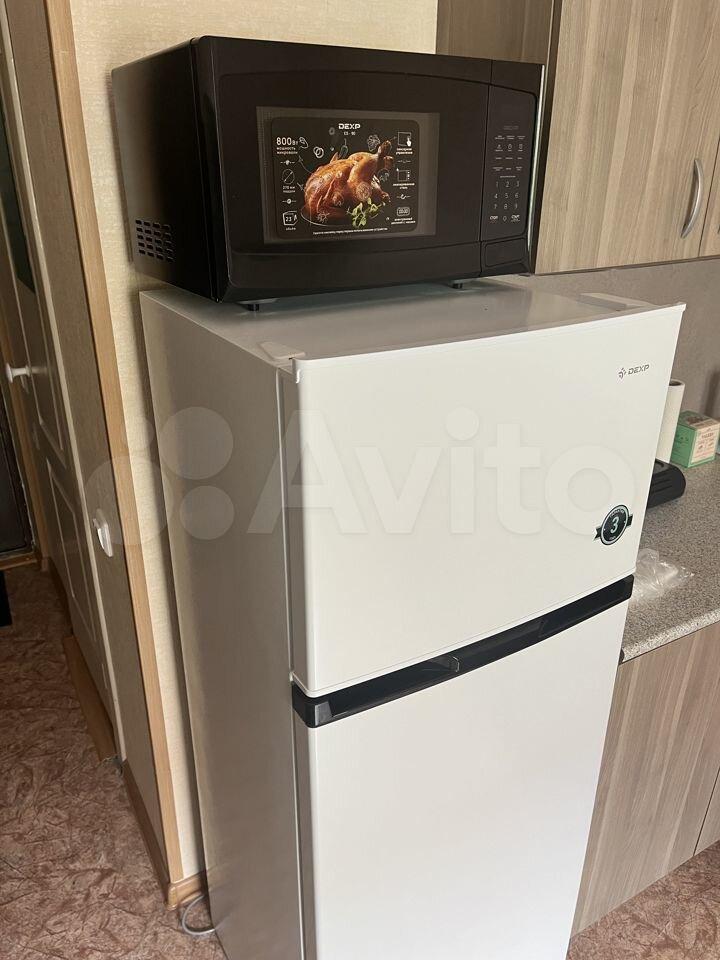 холодильник, плита, микроволновка, телевизор.