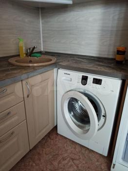 Внутри есть кухонный новый гарнитур, раскладной диван на два спальных места, большая стенка, журнальный столик, кухонный стол, холодильник, стиральная машина. Санузел совмещённый. В квартире порядок.