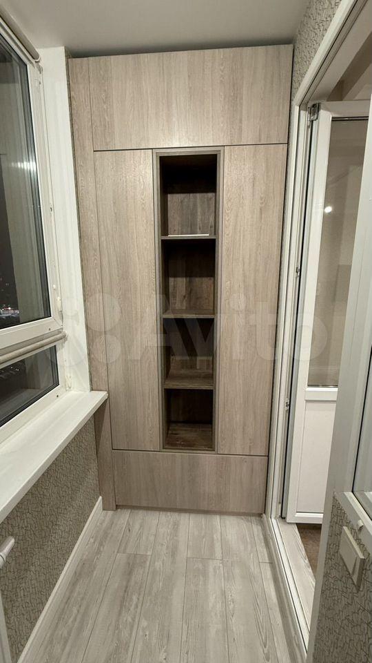 Застекленная благоустроенная лоджия с освещением, зонами хранения и отдыха.