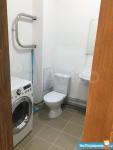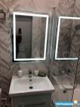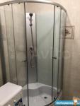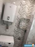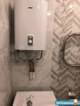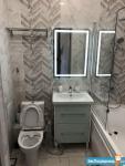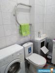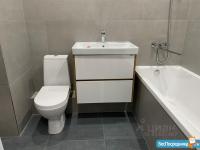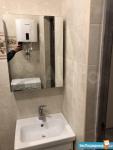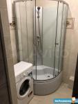 Душевая кабина, раковина с тумбой, зеркало с полочками внутри, стиральная машина - автомат, унитаз с гигиеническим душем, ну и бойлер для нагрева воды в случае отключения горячей.