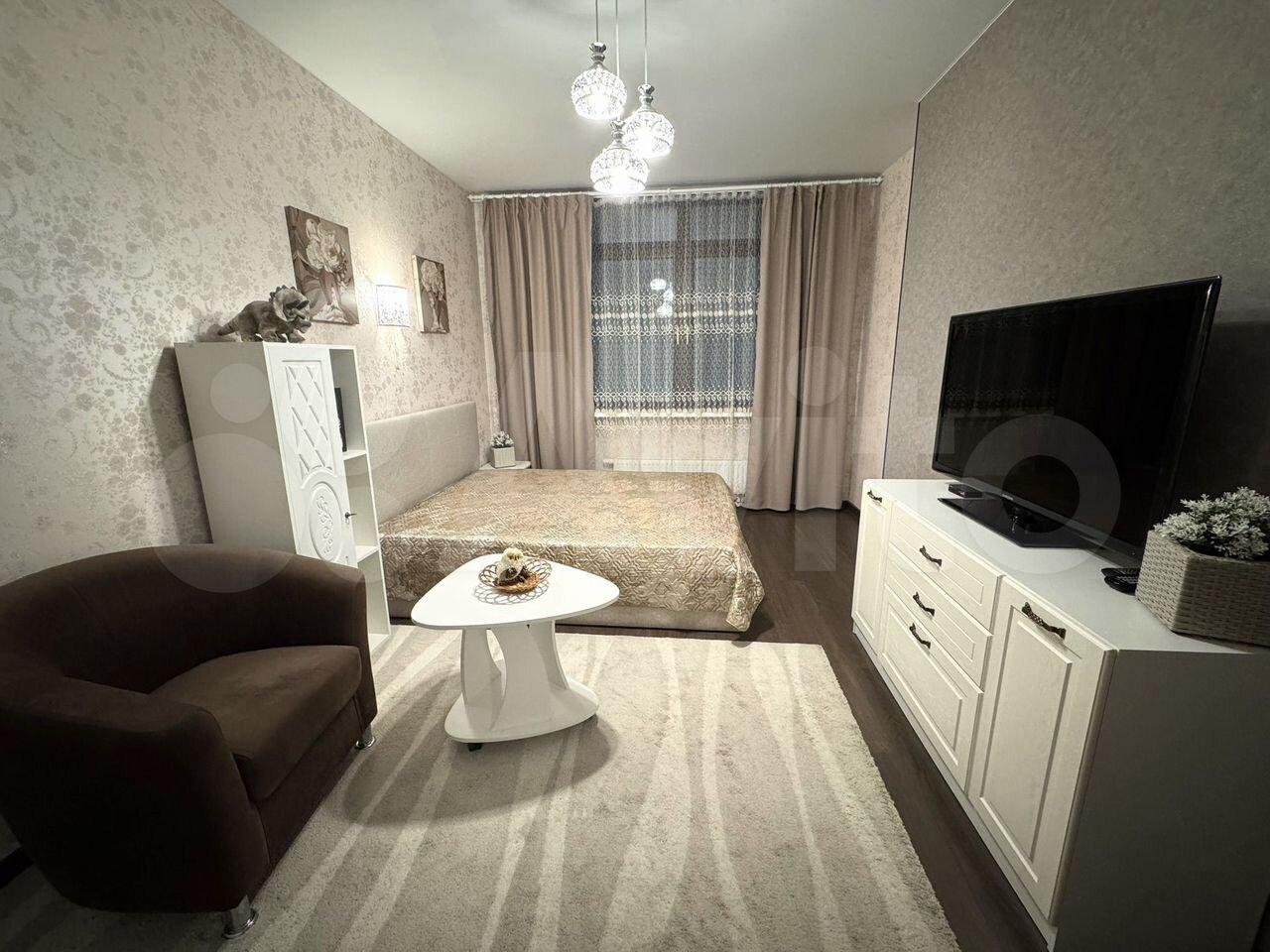 ЖК" Атлант Сити" От собственника, все фото реальные. Кухня-гостинная 15 кв.м , спальня 18 кв.м, лоджия 6 кв.м из которой сделан кабинет. Этаж 2 ой жилой, уровень 4 этажа. Круглосуточный консьерж, три минуты до ТЦ "Фантастика "48тыс..+ свет, вода по счетчикам. Залог 30 тыс.