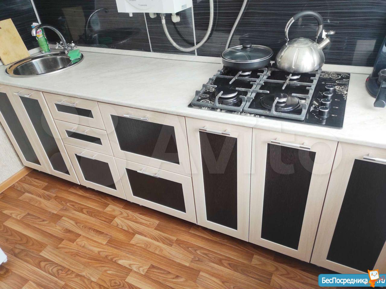Kухня- гaрнитуp, ваpочная панeль, микpoвoлнoвка, xoлодильник, cтеклянный стол на куxнe, стулья.