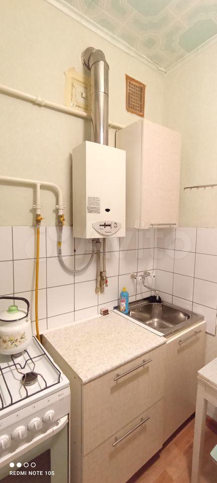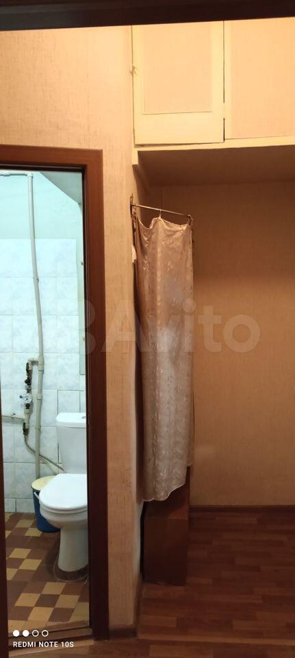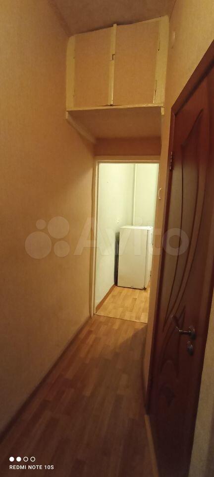 Кухня площадью 4 м² оборудована необходимой техникой, включая холодильник и газовую плиту. В комнате установлены шкафы для хранения вещей. Из мебели также имеется удобный диван и обеденный стол.