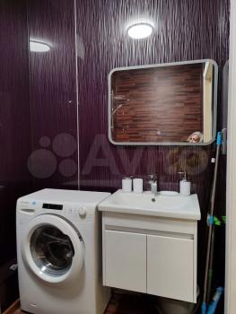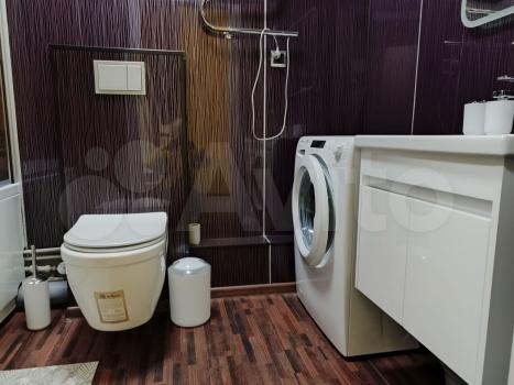 Санузел совмещенный, оформлен в современном стиле с использованием качественных материалов. В наличии ванна и стиральная машина