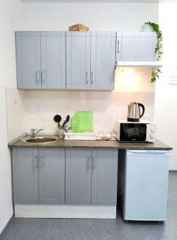 санузел - совмещённый, мебель - кухня, хранение одежды, спальные места, холодильник, плита, микроволновка, стиральная машина.