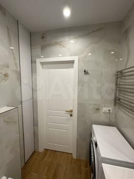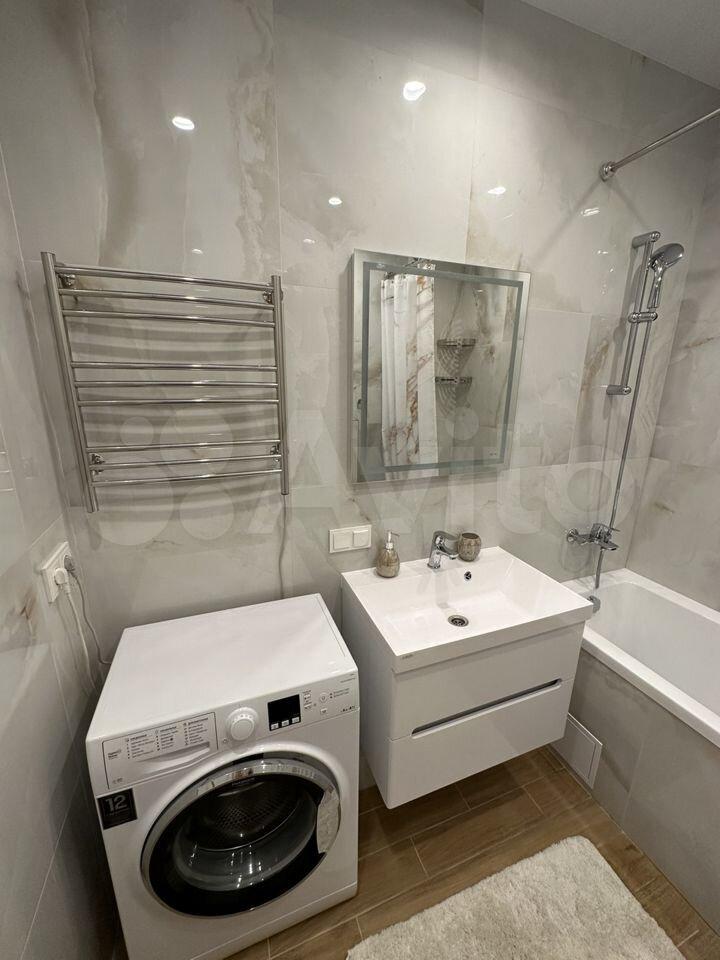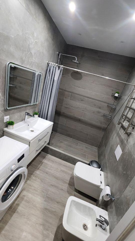 - Современная ванная комната с душевой кабиной и стиральной машиной.