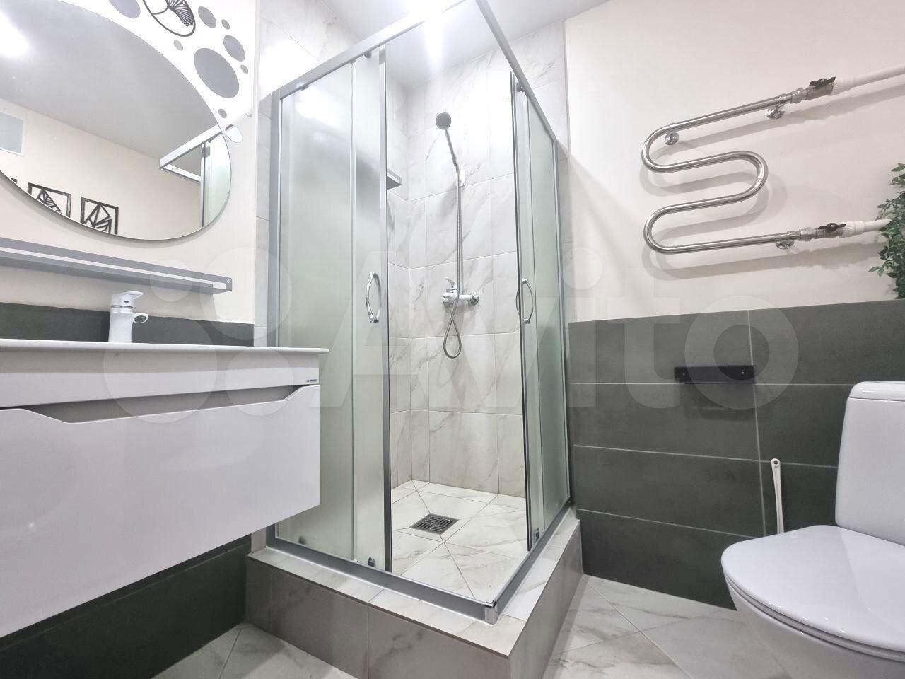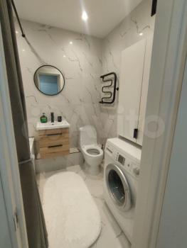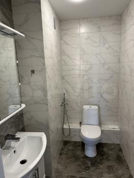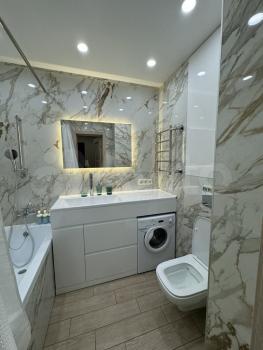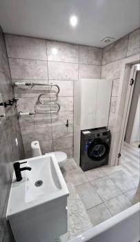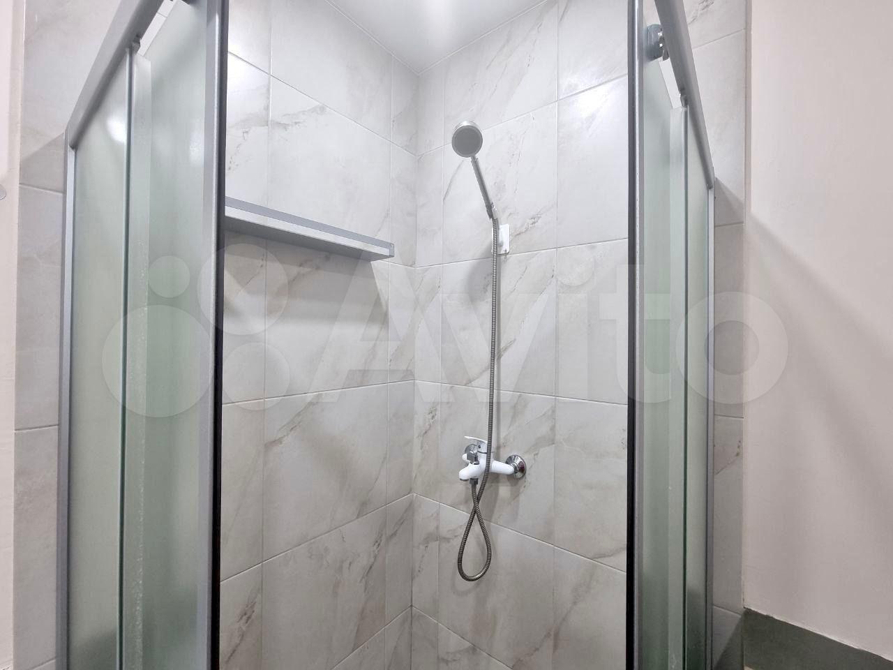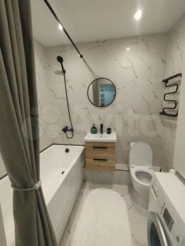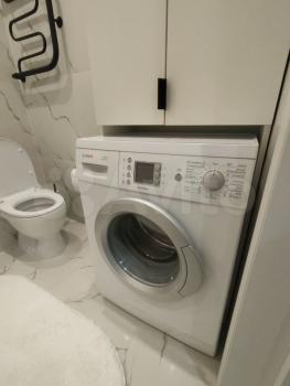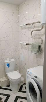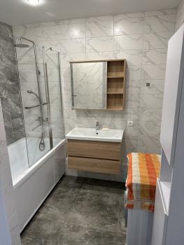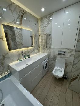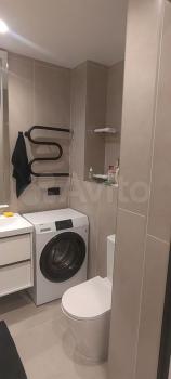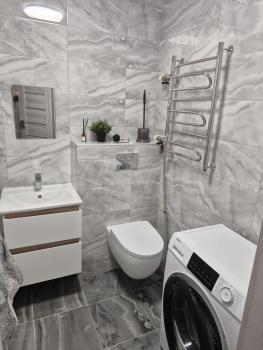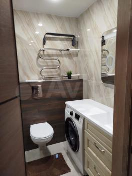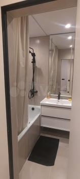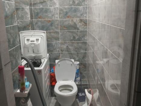 Совмещенный сан.узел в керамограните от пола до потолка, новая импортная сантехника. Есть встроенная система хранения, в которой установлен нагревательный бойлер - на время отключения горячей воды в летний период.