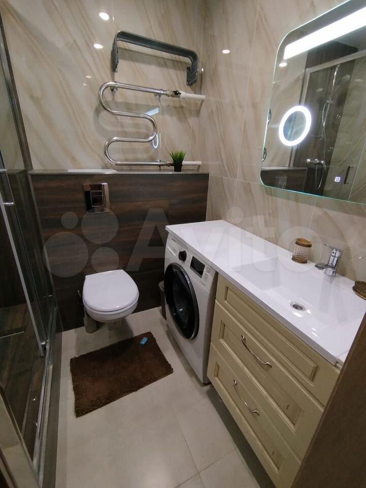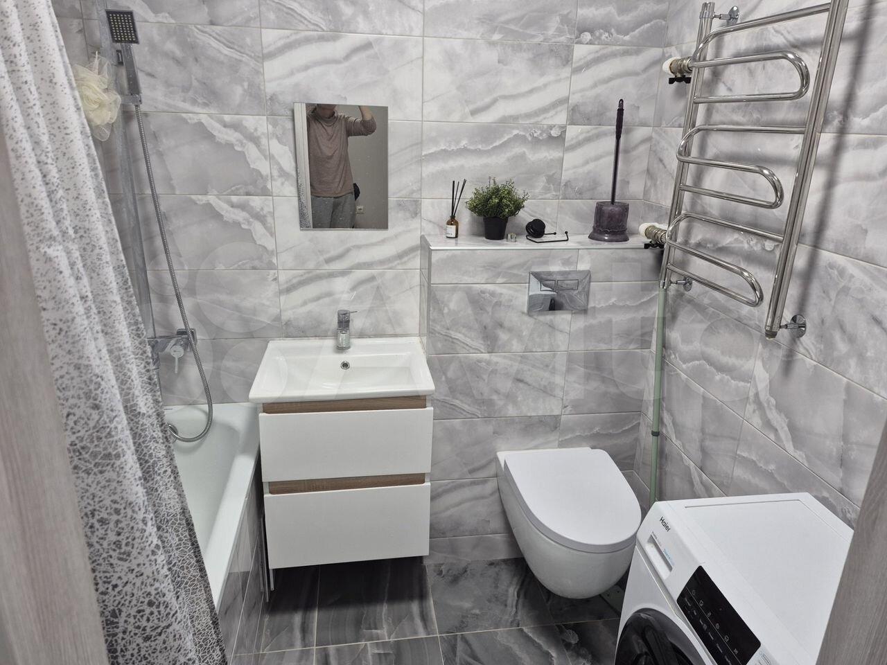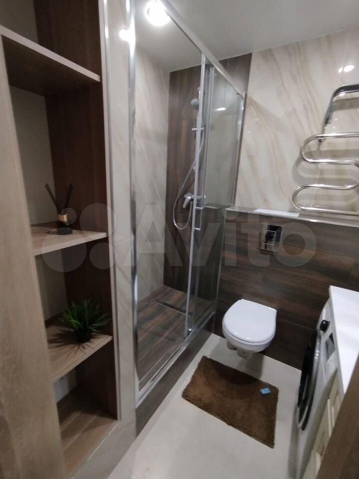 Совмещенный сан.узел в керамограните от пола до потолка, новая импортная сантехника. Есть встроенная система хранения, в которой установлен нагревательный бойлер - на время отключения горячей воды в летний период.