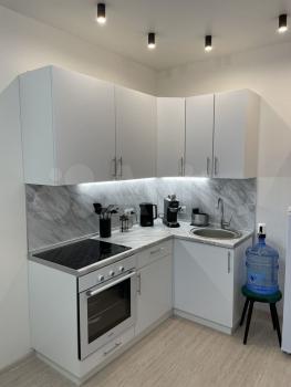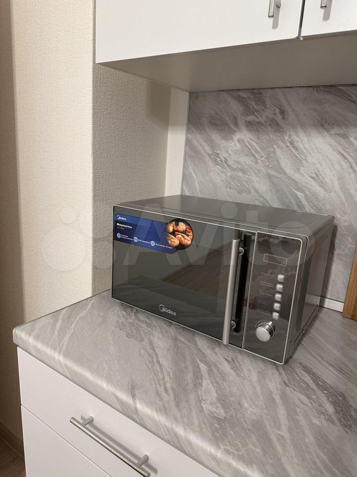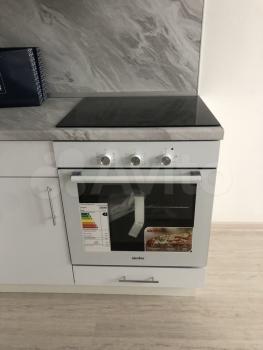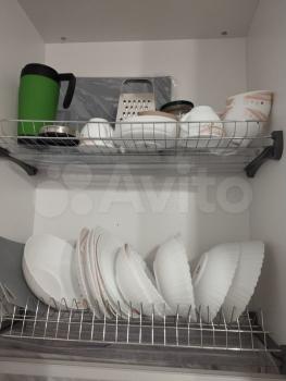 Кухонный гарнитур, техника (варочная панель, духовой шкаф, СВЧ, чайник, холодильник, стиральная машина, все новое, на гарантии) имеется вся посуда, от стаканов до кастрюль.