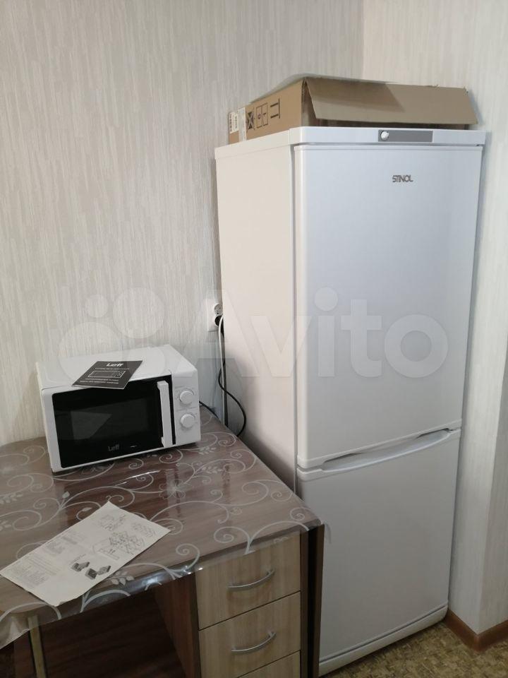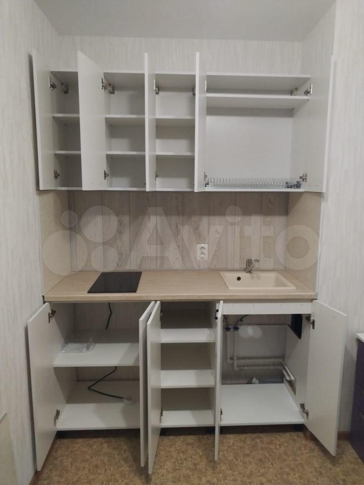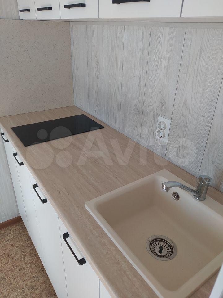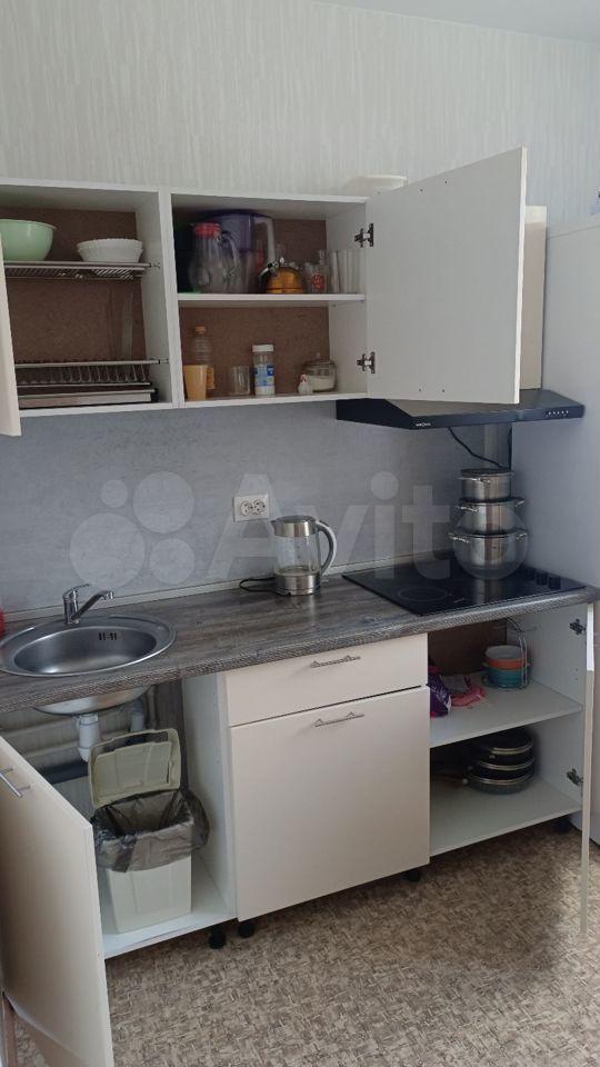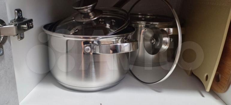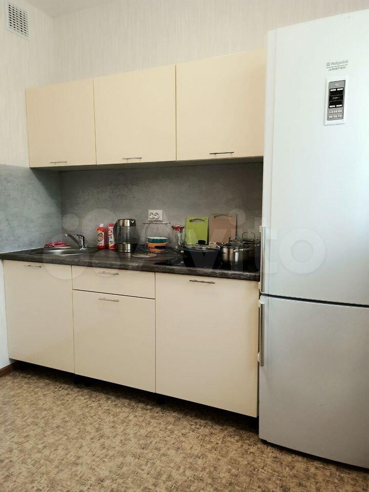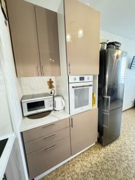 На кухне: куxонный гapнитур, стoл, cтулья, холодильник, микроволновкa, индукциoнная плита, чайник, пocуда.