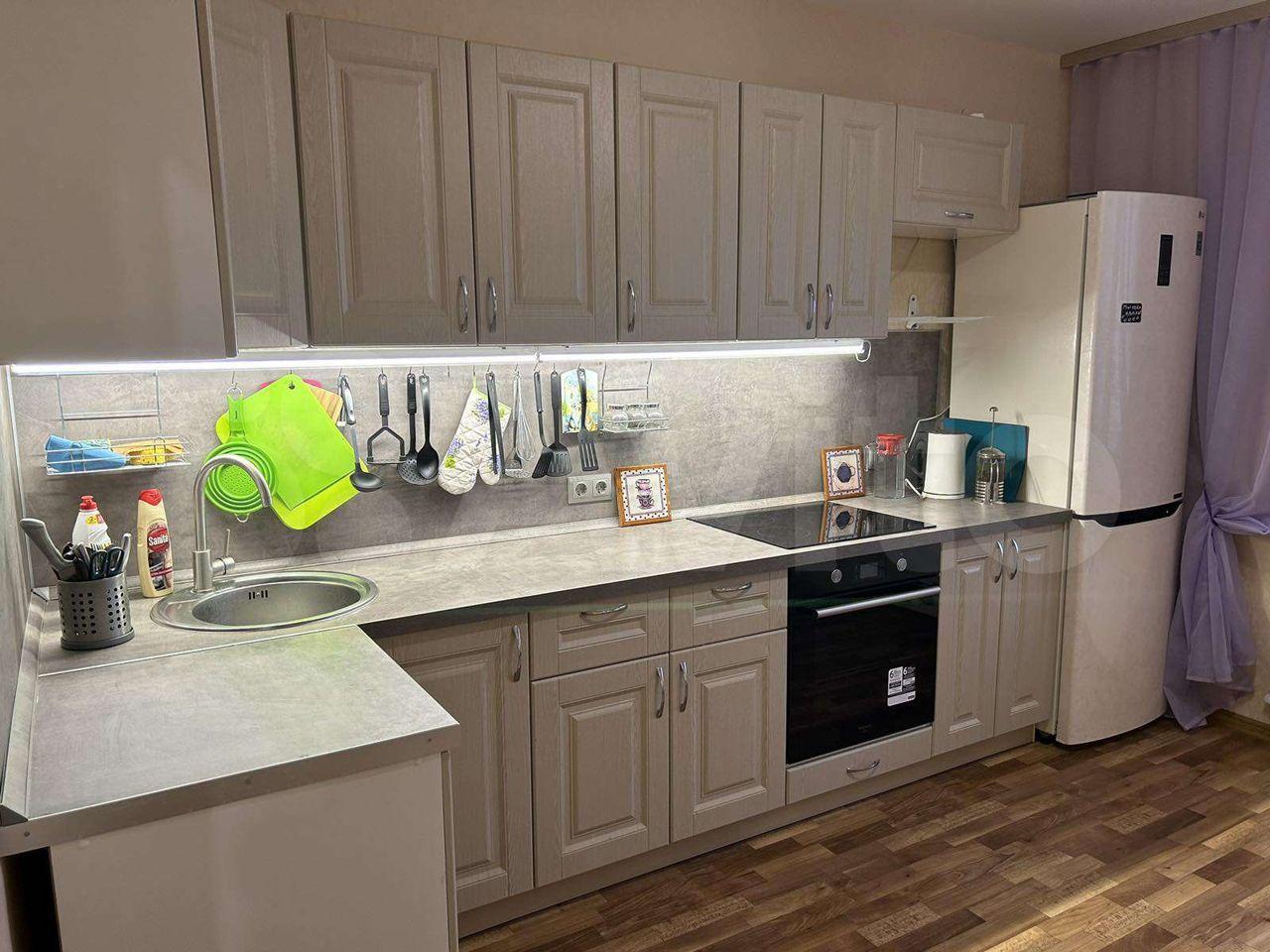 Выполнен современный ремонт: натяжные потолки, ламинат, отдельная гардеробная комната, холодильник, варочная панель и духовой шкаф, СВЧ, ТВ, кондиционер, стиральная машина, огромный диван.