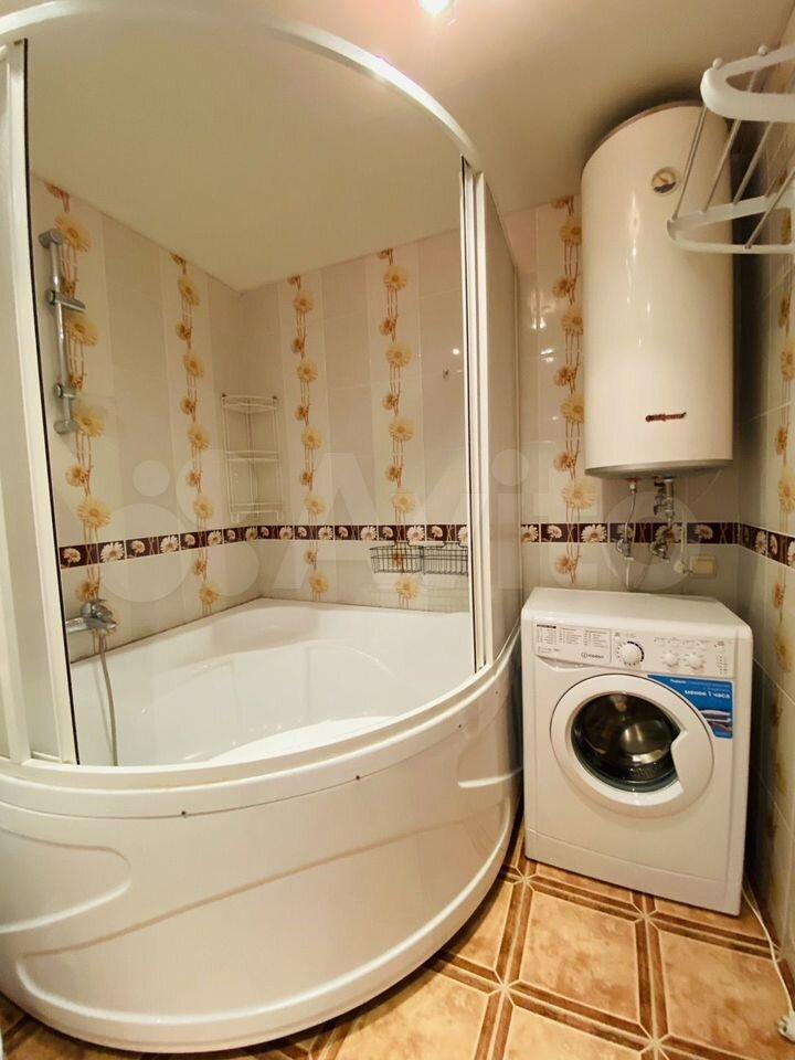 В ванной большая угловая ванна, бойлер, новая стиральная машина, стильная раковина с зеркалом, встроенный шкафчик.