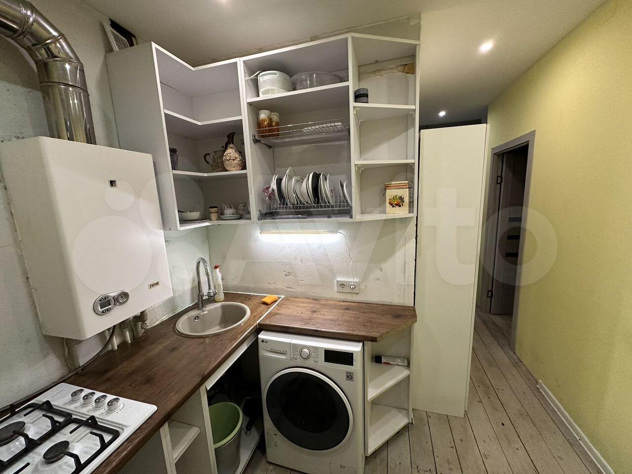 Кухня компактная, площадью 5 м², оснащена необходимой бытовой техникой, включая плиту и стиральную машину. Санузел совмещенный, оформлен в светлых тонах.