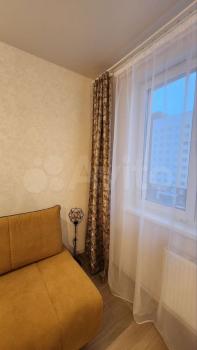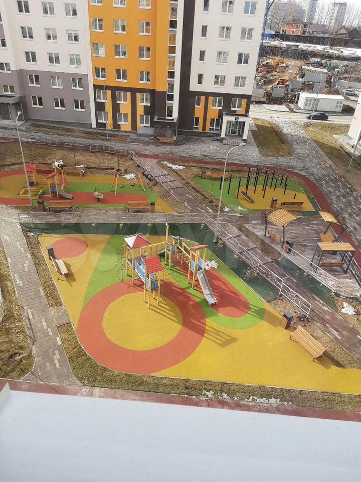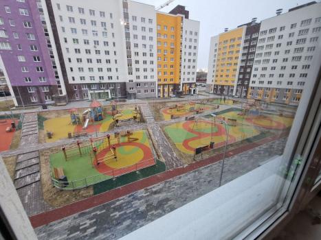 В квартире одна спальня, большая жилая кухня, отличный вид из окон на две стороны ( детскую площадку и городские просторы), что является редкостью для однакомнатных квартир.