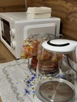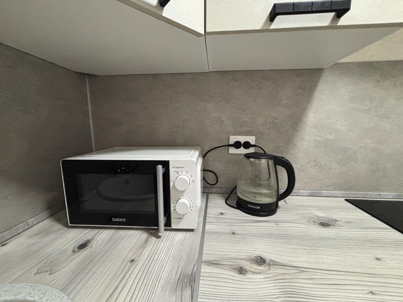 В обеденной зоне также имеется микроволновка и электрический чайник, небольшой комплект посуды для личного пользования