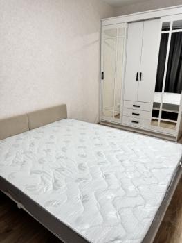 - В спальня новые двухспальная кровать, матрас, большой шкаф