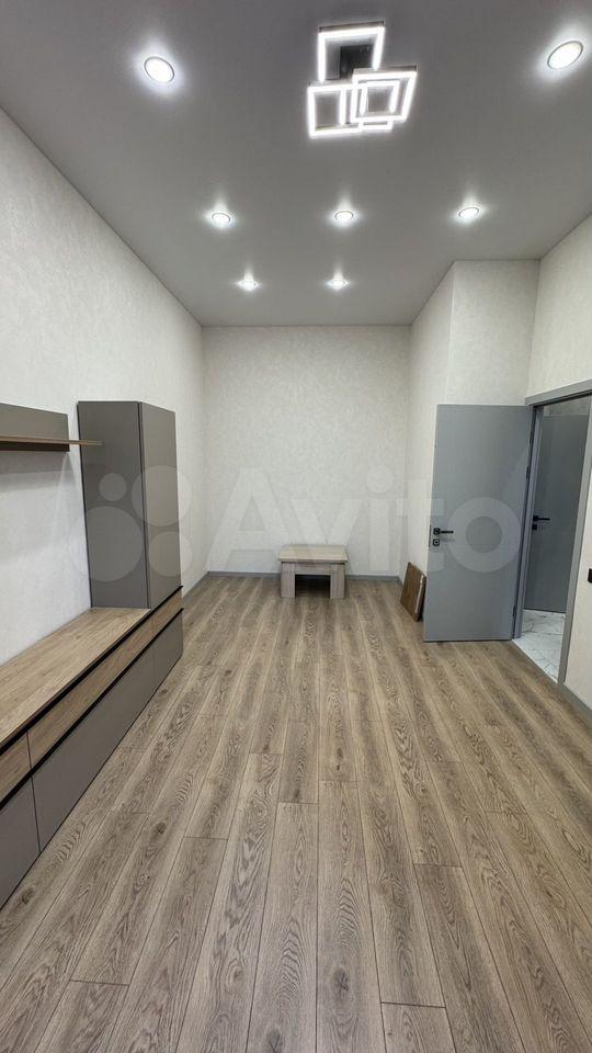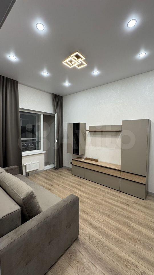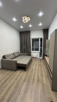 Гостиная с выделенной зоной спальни, ТВ, кровать с ортопедическим матрасом (160*200), вся необходимая мебель, диван, есть рабочая зона, Wi-Fi, акцентная подсветка, шумоизоляция, проходные переключатели, теплый пол.