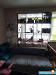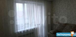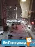 Площадь комнаты 21 кв.м. - одно большое окно и стеклянная балконная дверь на другой стене. Окна не на дорогу, не во двор. В комнате - Новый двухспальный диван, шторы.