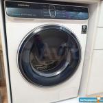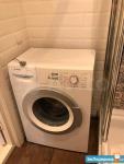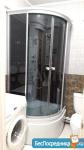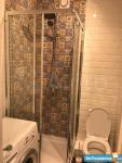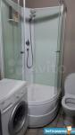 В уютной ванной комнате душевая кабина с душевой системой и верхним душем, сантехника Grohe, керамика Cersanit и стиральная машинка Bosch.