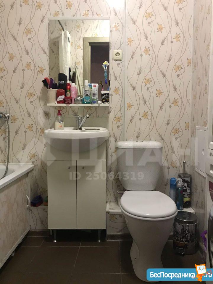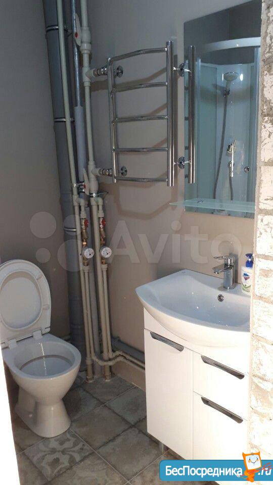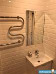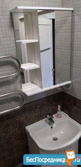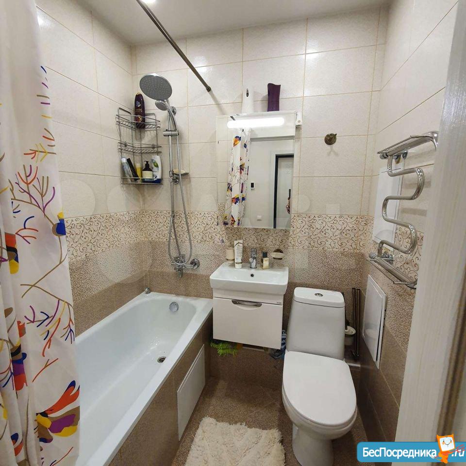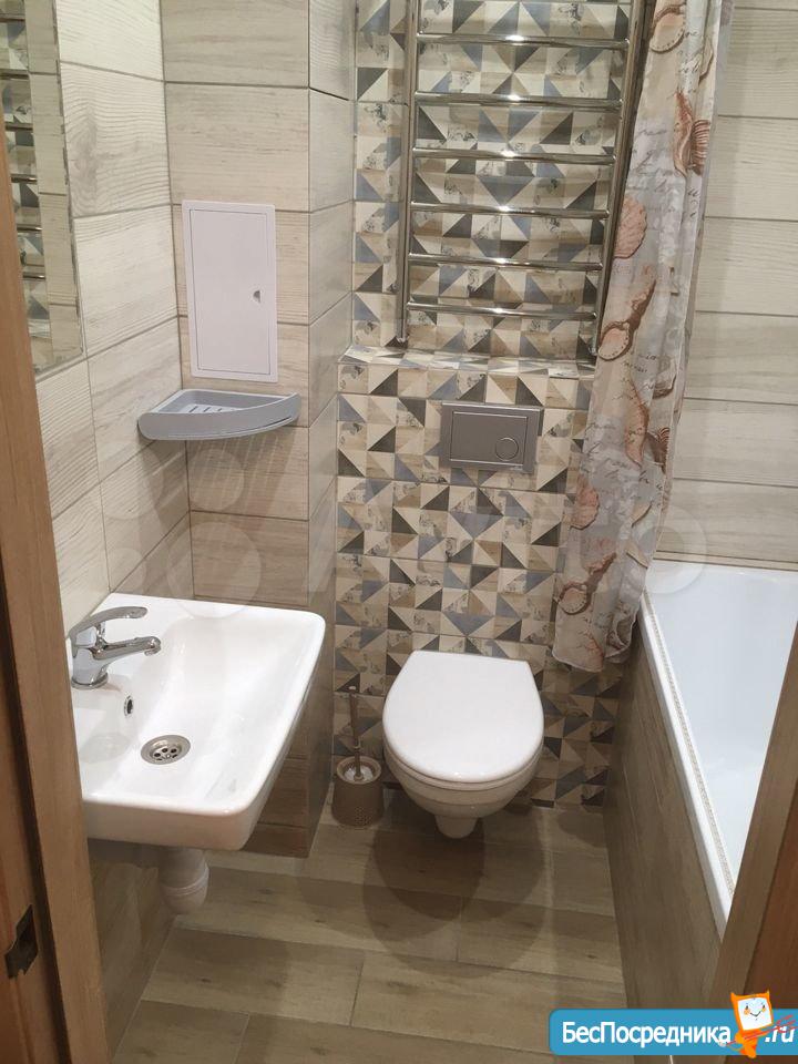 Ванная совмещенная - новая сантехника, тумба с раковиной, зеркало.