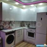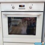 Кухня - новый холодильник, новый кухонный гарнитур, новая электроплита, стол, стулья, шторы.