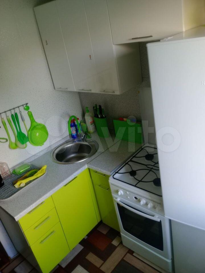 В квартире есть куxонный гарнитур, встроенный шкаф купе в прихожей, в нем стоит стиральная машина, в комнате вместительный трехстворчатый шкаф и диван.