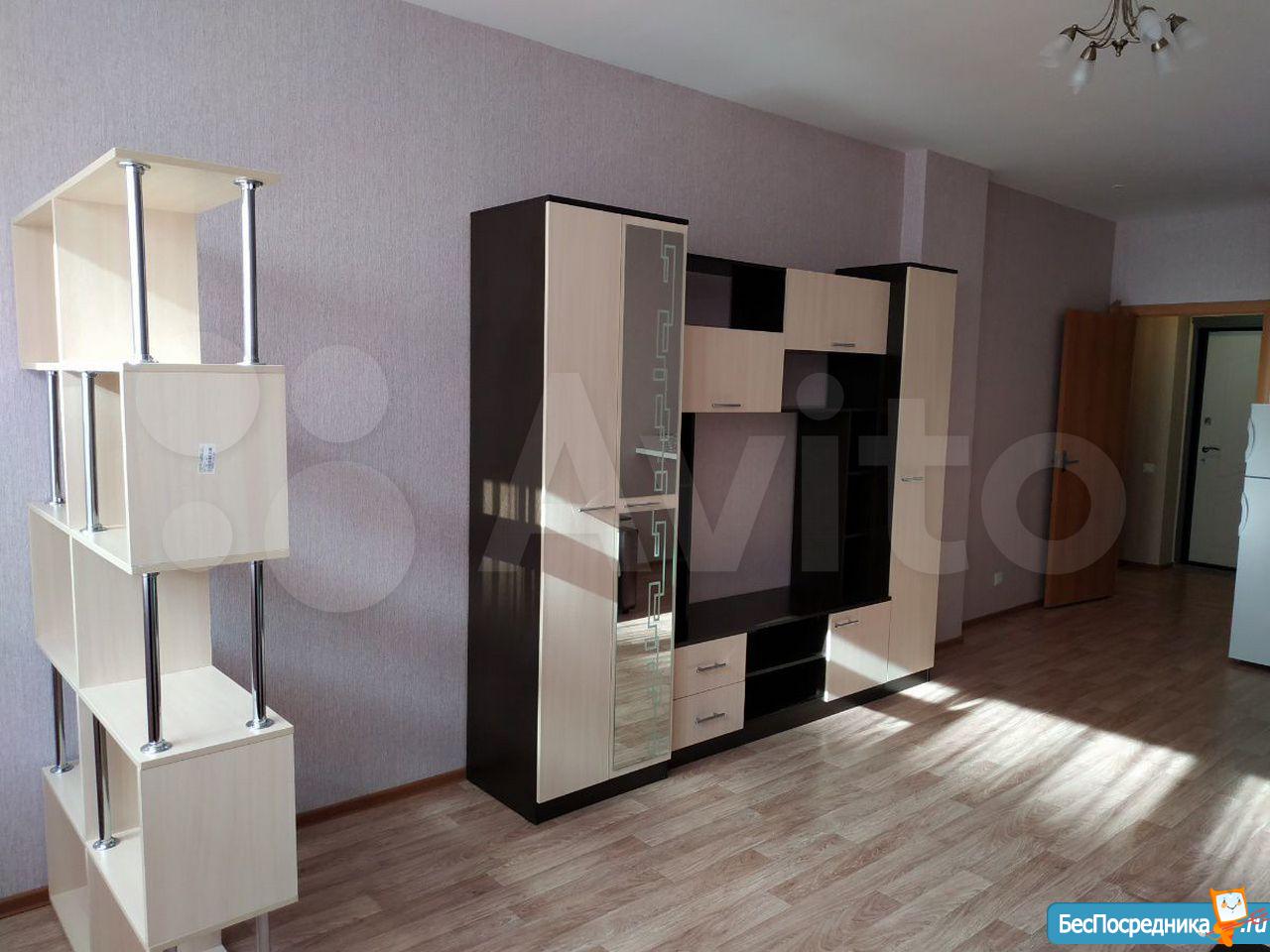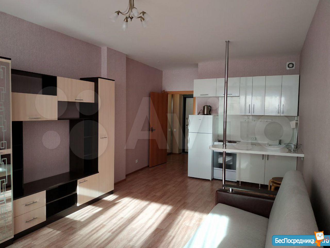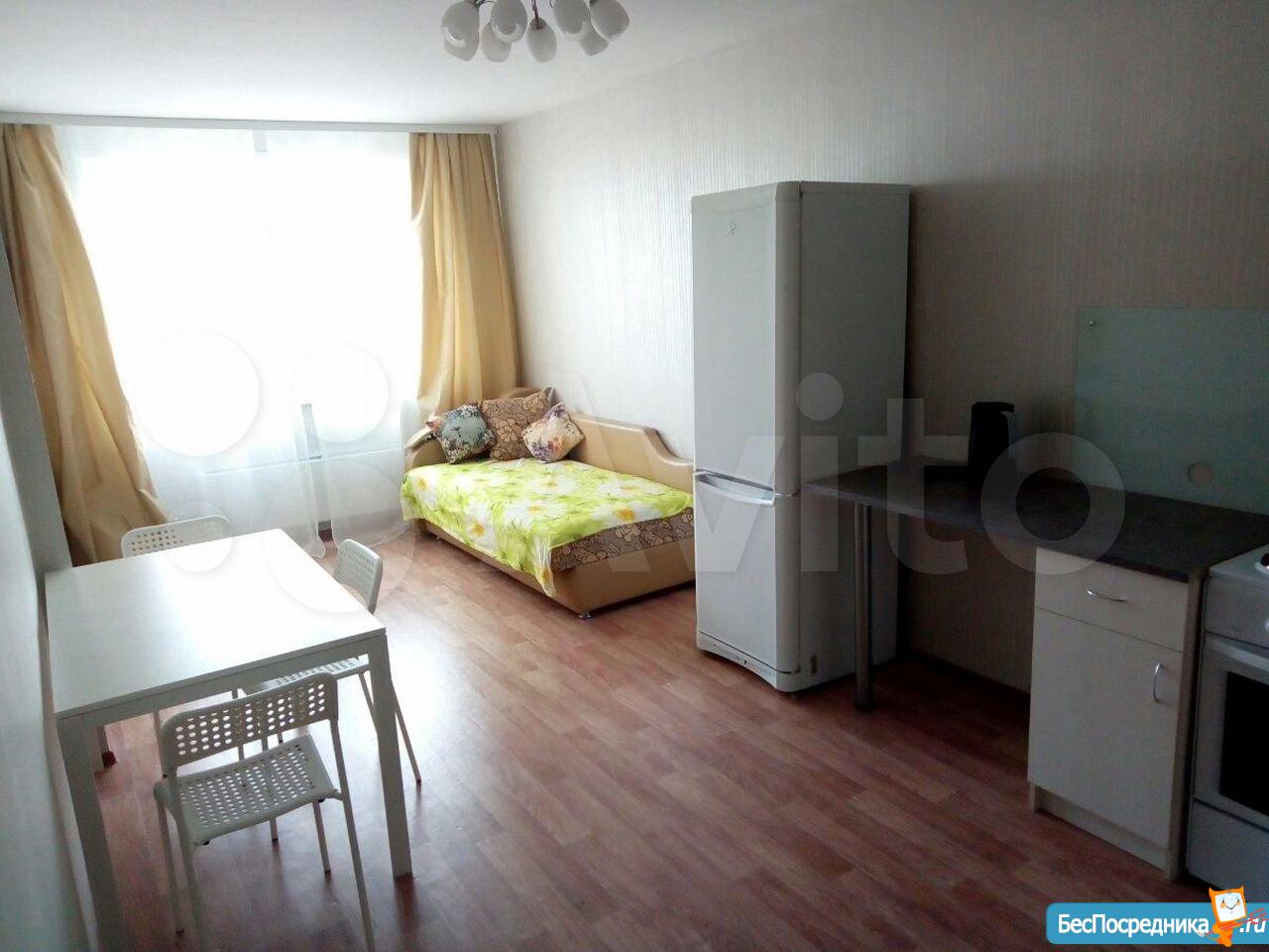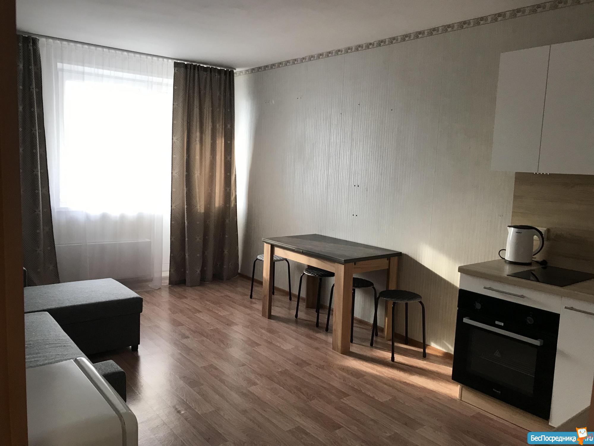 Студия с мебелью в новом 19-этажном доме. На этажах видеонаблюдение. Арендная плата плюс коммунальные расходы по счётчику (вода+электричество). Рядом находится супермаркет Карусель, Макдональдс. Удобная транспортная развязка (Московское шоссе).