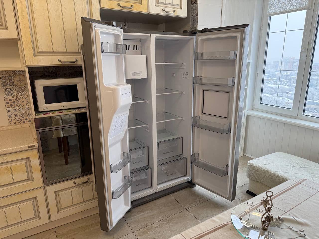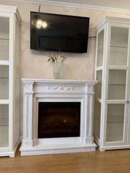 * Эффектная просторная кухня-гостинная с мраморным камином. Кухня укомплектована холодильником сайд - бай- сайд, варочной поверхностью и духовкой Ariston Hotpoint, посудомоечной машиной, электрической вытяжкой, микроволновкой, обеденным столом и 4 стульями. В гостиной уголок для рукоделия и чтения (можно переделать в рабочую зону), вместительный новый диван, раскладывающийся в полноценное двуспальное место, мраморный камин и книжные шкафы, телевизор.