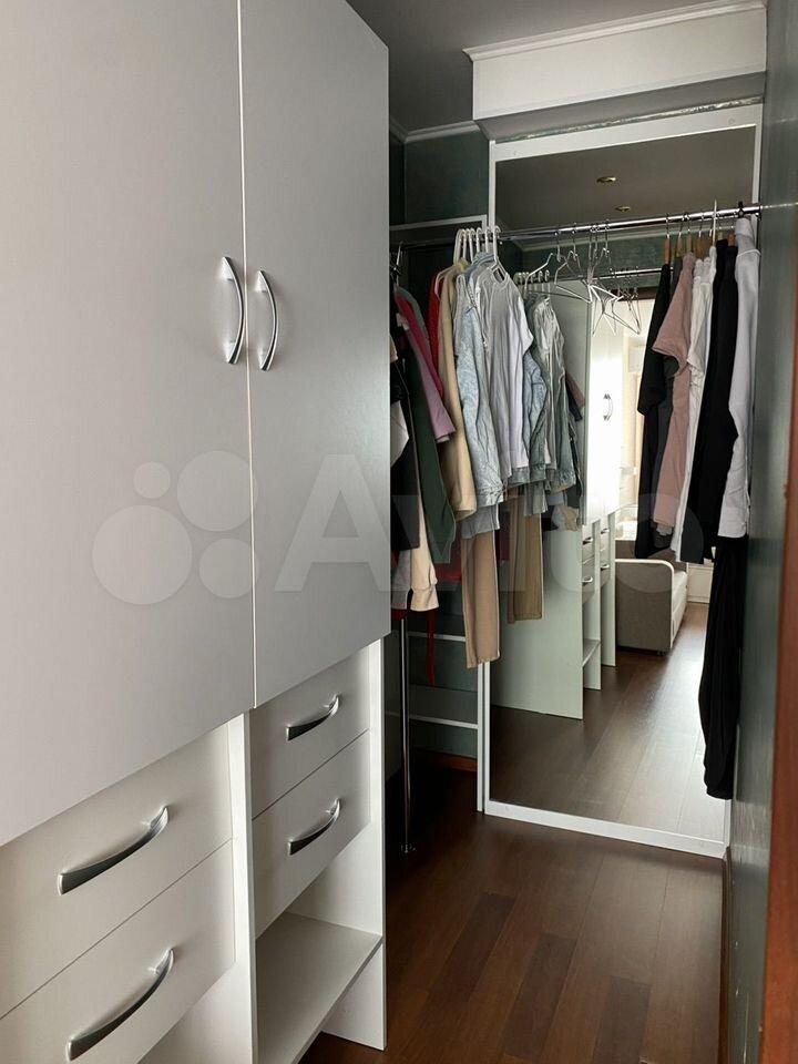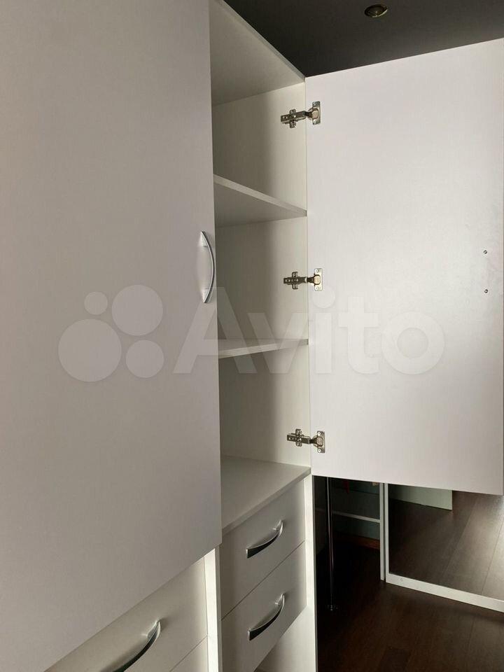 Из мебели новый диван-кровать, функциональная зона отдыха, встроенный шкаф для хранения, отдельная гардеробная.