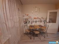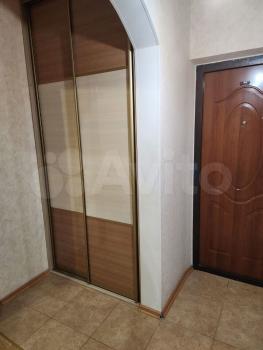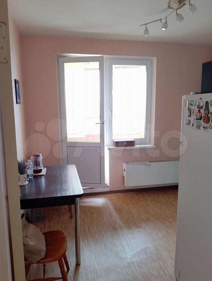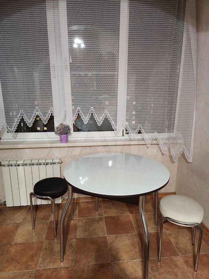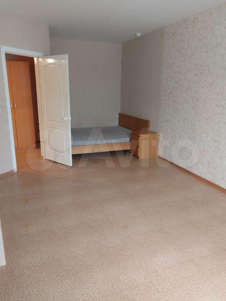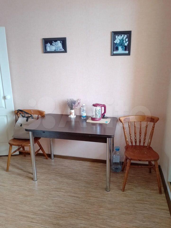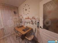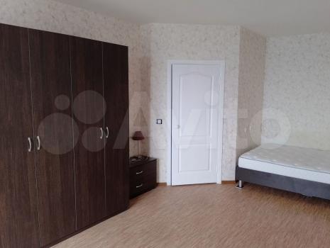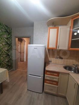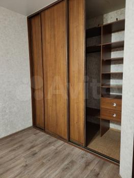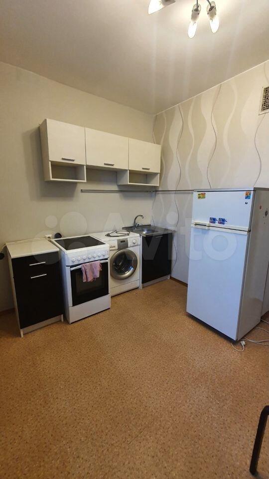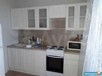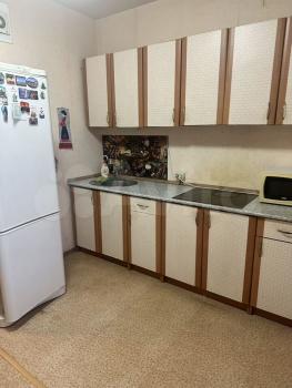 В квартире выполнен косметический ремонт. Просторная комната оборудована шкафами и диваном. На кухне установлена современная бытовая техника, включая холодильник и стиральную машину. Также имеется обеденный стол и стулья.