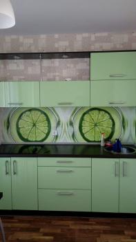 2) Большая кухня с кухонным гарнитуром, холодильником и плитой. Обеденный стол. Застекленная лоджия.
