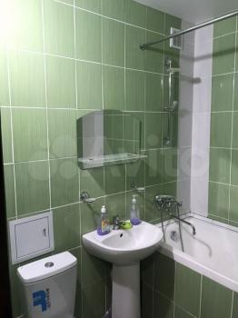 Санузел совмещенный, оформлен свежими плитками зеленого цвета. В прихожей предусмотрены удобные полки для хранения вещей.