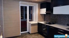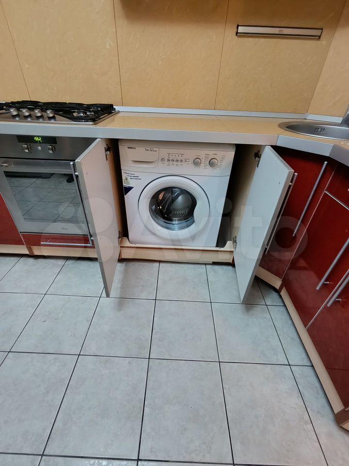 В квартире встроенная кухня со встроенной техникой, стиральная машина, холодильник, диван.