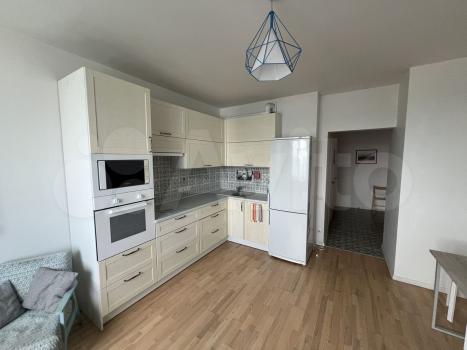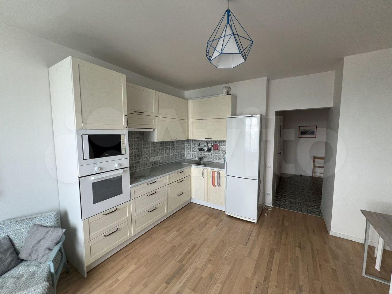 Просторная комната 20м2 без мебели. Кухня 12м2: кухонный гарнитур, варочная панель (стеклокерамика), духовка, холодильник. Санузел совмещеный: большая угловая ванна, стиральная машина. В квартире есть отдельная гардеробная, балкон.