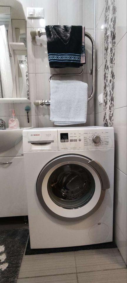 Есть стиральная машина, гладильная доска, телевизор.