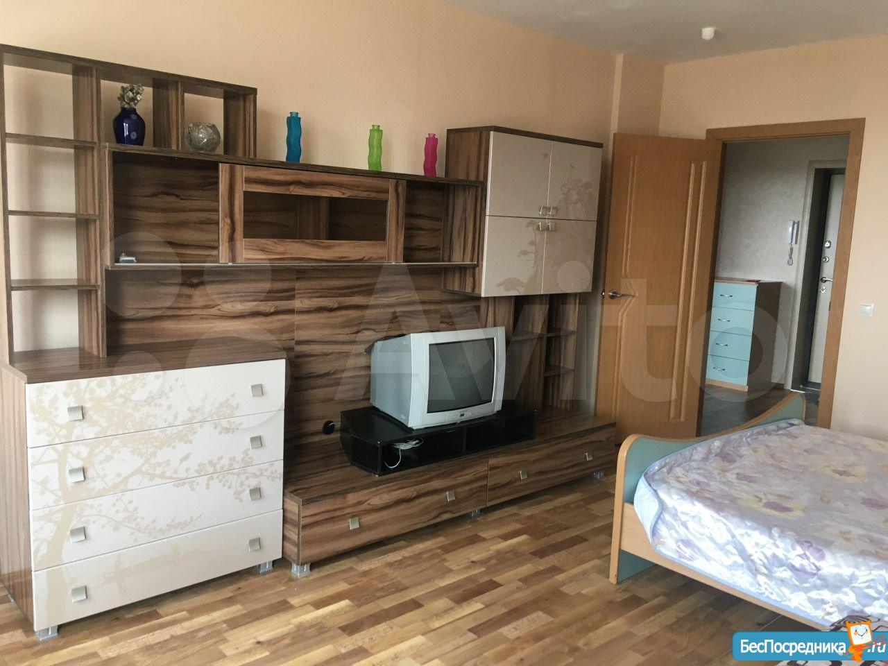 Квартира меблирована. В наличии стенка, 2-х спальная кровать + диван, шкаф-купе, телевизор, кухонный гарнитур, стиральная машина Indesit, холодильник, эл.плита. Заведен интернет.